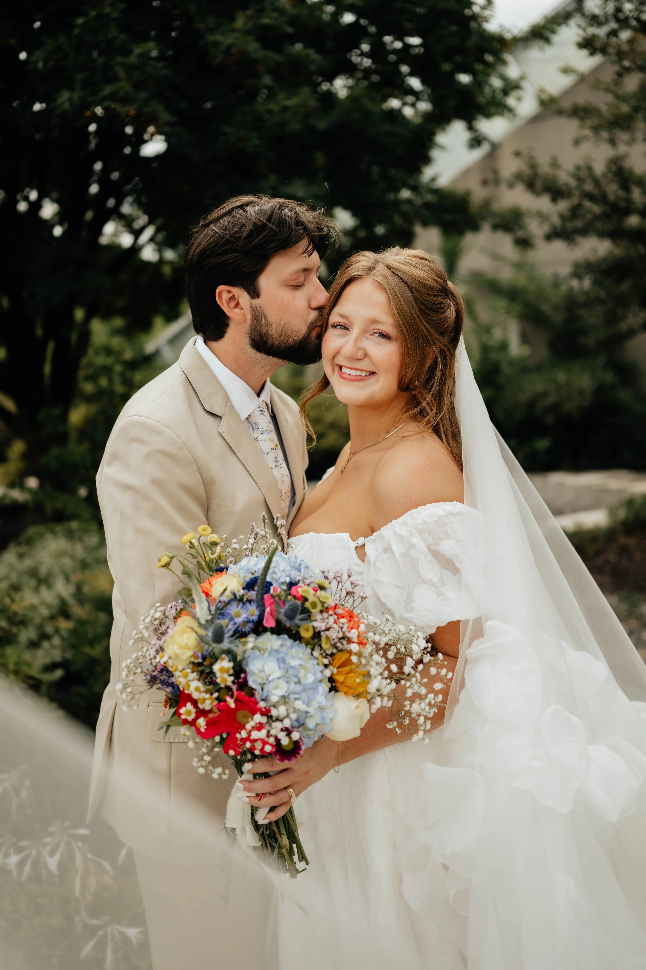 A bride and groom in wedding attire standing outdoors near a large tree, smiling at the camera with a backdrop of greenery and a building.